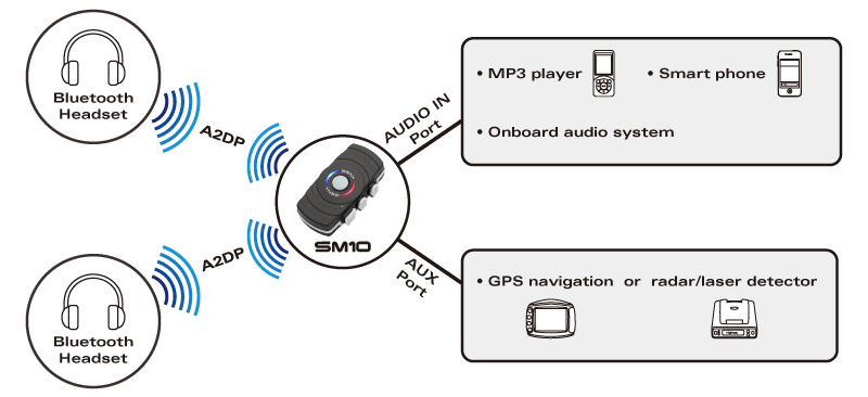 Along with the dual streaming feature of SM10, both you and your passenger may listen to the same music or radio at the same time by using Bluetooth headsets in the market. The SM10 has AUX audio input that enables you to connect additional non-Bluetooth audio devices such as radar/laser detector or GPS navigation.